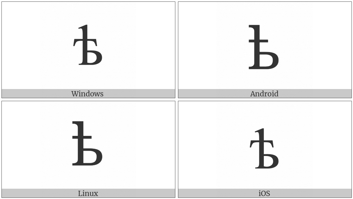 The image below shows how the “Cyrillic Small Letter Yat” symbol might look like on different operating systems. If the font in which this web site is displayed does not contain the symbol and there is no fallback font able to render it, you can use the image below to get an idea of what it should look like.