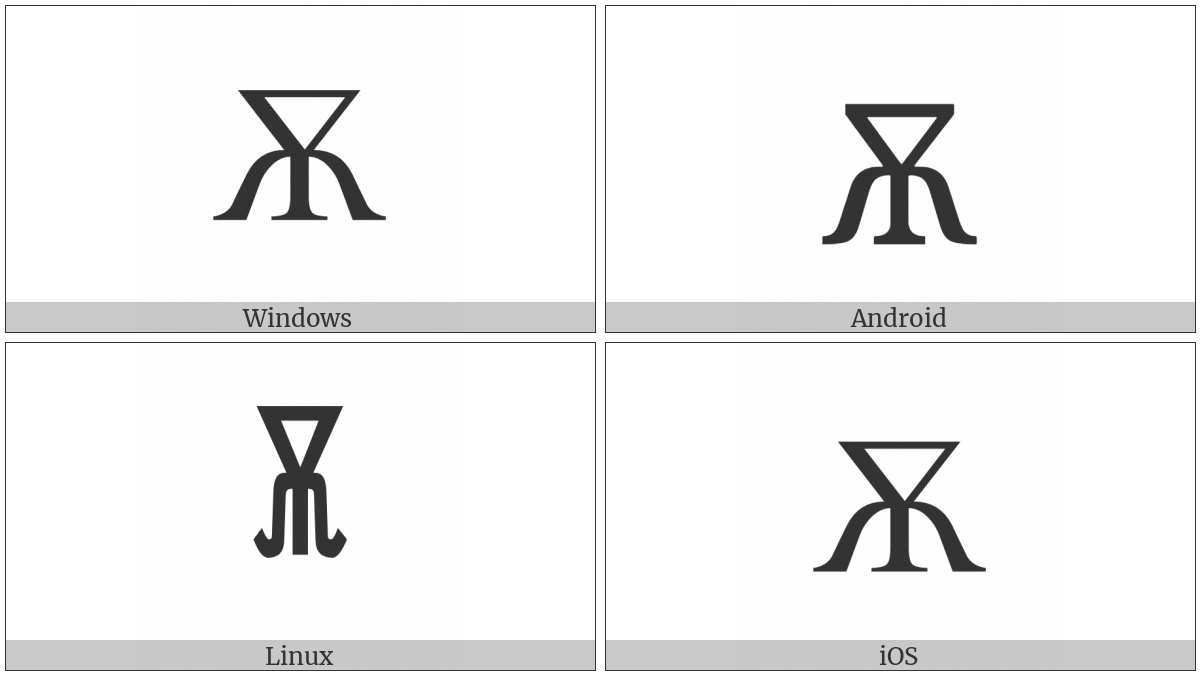 The image below shows how the “Cyrillic Capital Letter Big Yus” symbol might look like on different operating systems. If the font in which this web site is displayed does not contain the symbol and there is no fallback font able to render it, you can use the image below to get an idea of what it should look like.