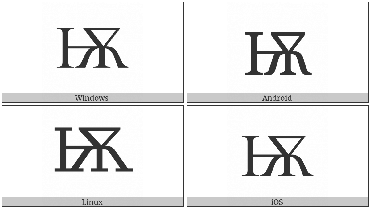 The image below shows how the “Cyrillic Capital Letter Iotified Big Yus” symbol might look like on different operating systems. If the font in which this web site is displayed does not contain the symbol and there is no fallback font able to render it, you can use the image below to get an idea of what it should look like.