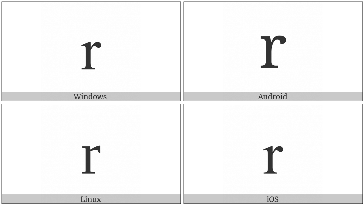 The image below shows how the “Latin Small Letter R” symbol might look like on different operating systems. If the font in which this web site is displayed does not contain the symbol and there is no fallback font able to render it, you can use the image below to get an idea of what it should look like.