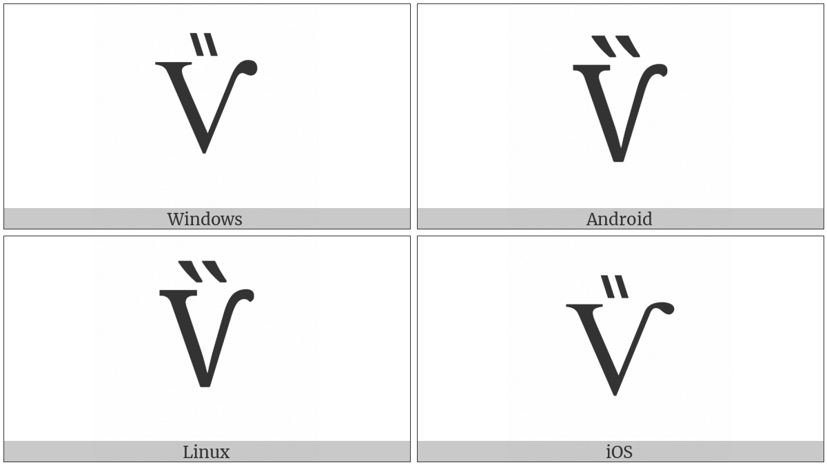 The image below shows how the “Cyrillic Capital Letter Izhitsa With Double Grave Accent” symbol might look like on different operating systems. If the font in which this web site is displayed does not contain the symbol and there is no fallback font able to render it, you can use the image below to get an idea of what it should look like.