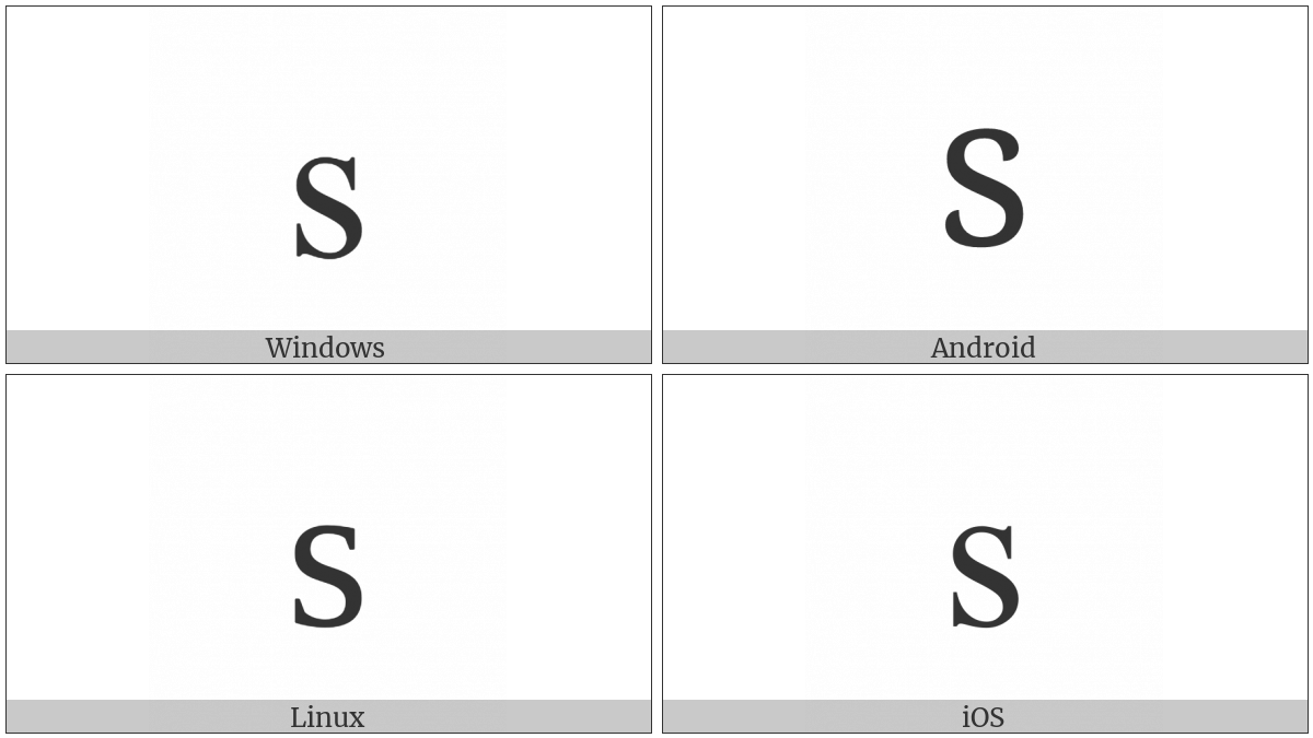 The image below shows how the “Latin Small Letter S” symbol might look like on different operating systems. If the font in which this web site is displayed does not contain the symbol and there is no fallback font able to render it, you can use the image below to get an idea of what it should look like.