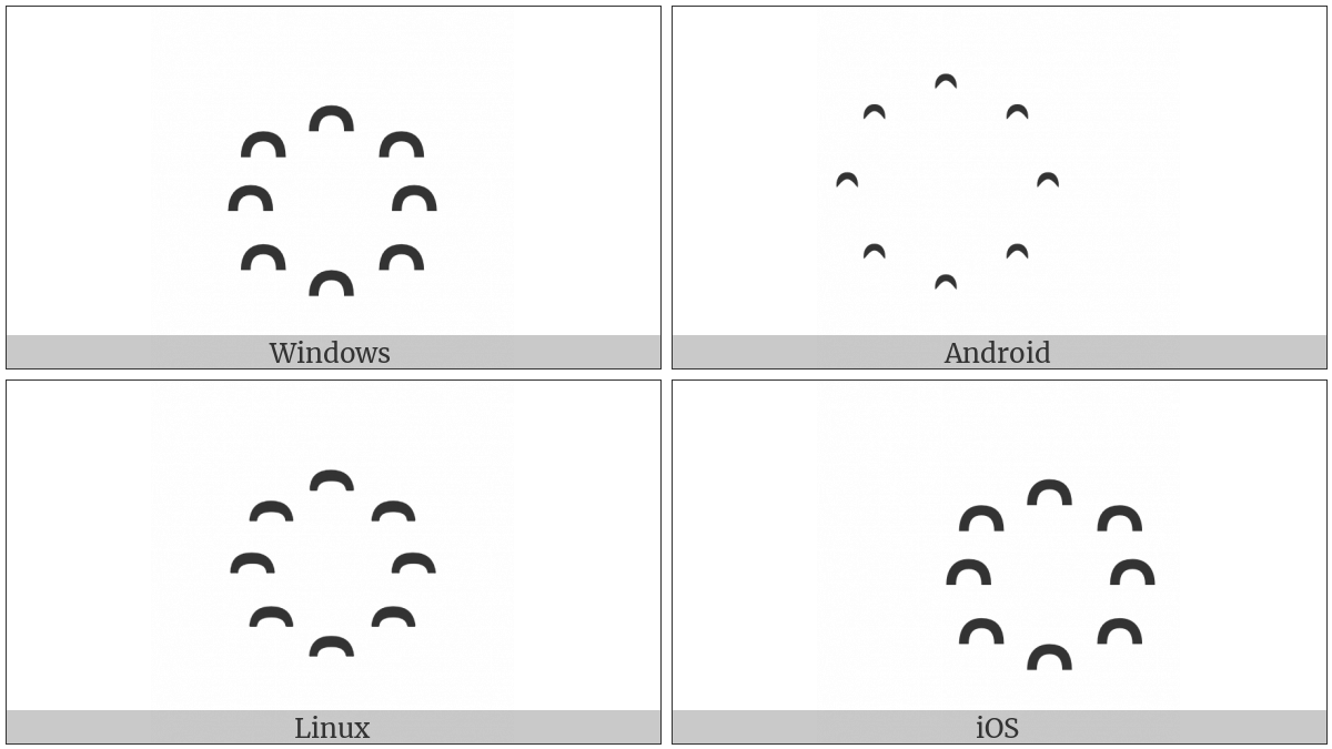 The image below shows how the “Combining Cyrillic Hundred Thousands Sign” symbol might look like on different operating systems. If the font in which this web site is displayed does not contain the symbol and there is no fallback font able to render it, you can use the image below to get an idea of what it should look like.