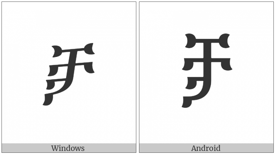The image below shows how the “Ethiopic Syllable Ccaa” symbol might look like on different operating systems. If the font in which this web site is displayed does not contain the symbol and there is no fallback font able to render it, you can use the image below to get an idea of what it should look like.