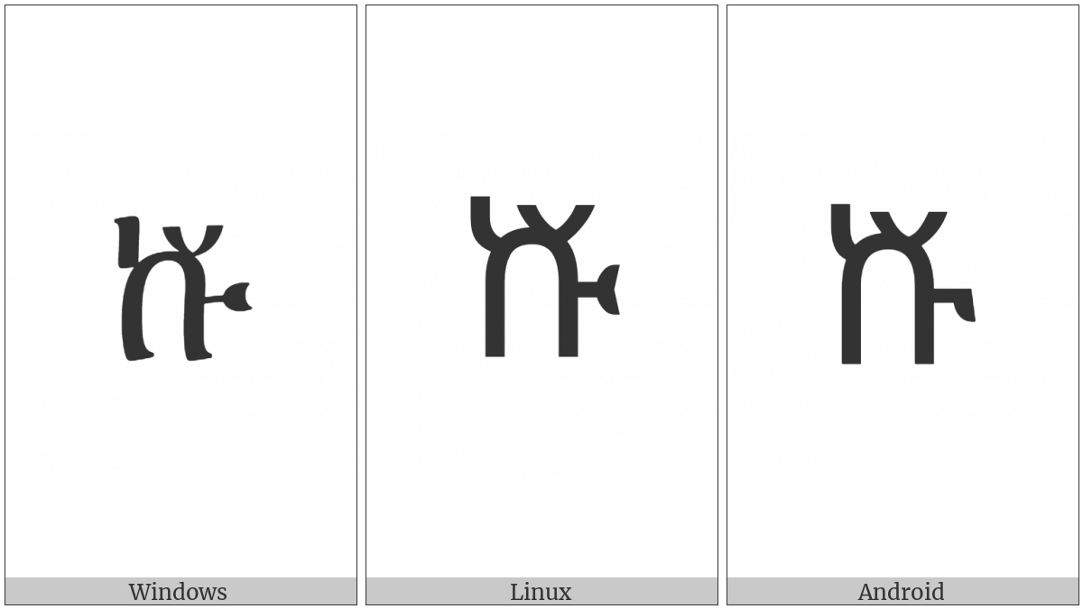 The image below shows how the “Ethiopic Syllable Kyu” symbol might look like on different operating systems. If the font in which this web site is displayed does not contain the symbol and there is no fallback font able to render it, you can use the image below to get an idea of what it should look like.