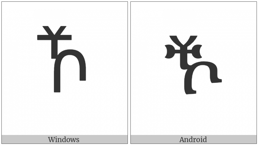 The image below shows how the “Ethiopic Syllable Xyo” symbol might look like on different operating systems. If the font in which this web site is displayed does not contain the symbol and there is no fallback font able to render it, you can use the image below to get an idea of what it should look like.
