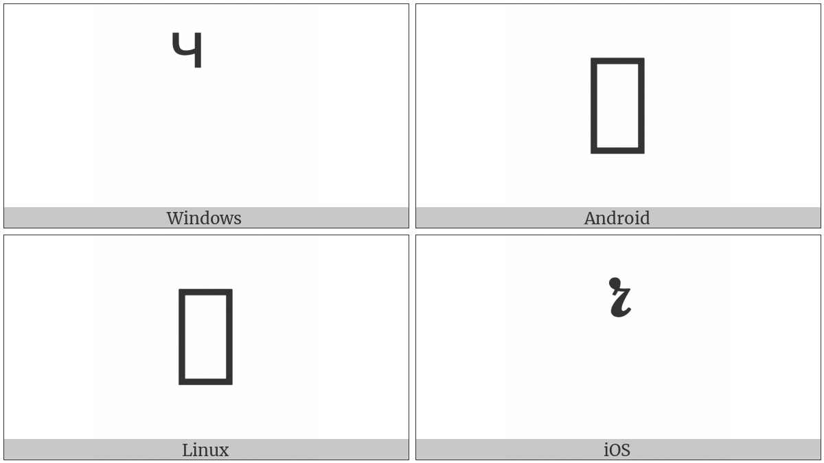 The image below shows how the “Combining Cyrillic Letter Che” symbol might look like on different operating systems. If the font in which this web site is displayed does not contain the symbol and there is no fallback font able to render it, you can use the image below to get an idea of what it should look like.