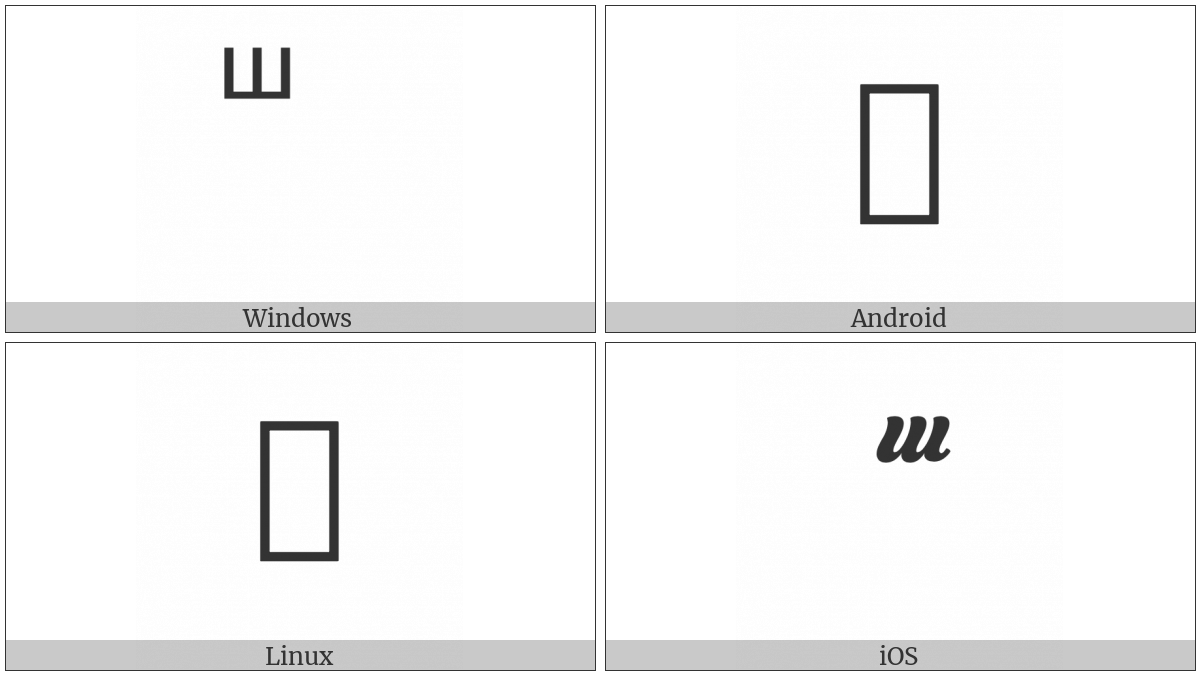 The image below shows how the “Combining Cyrillic Letter Sha” symbol might look like on different operating systems. If the font in which this web site is displayed does not contain the symbol and there is no fallback font able to render it, you can use the image below to get an idea of what it should look like.