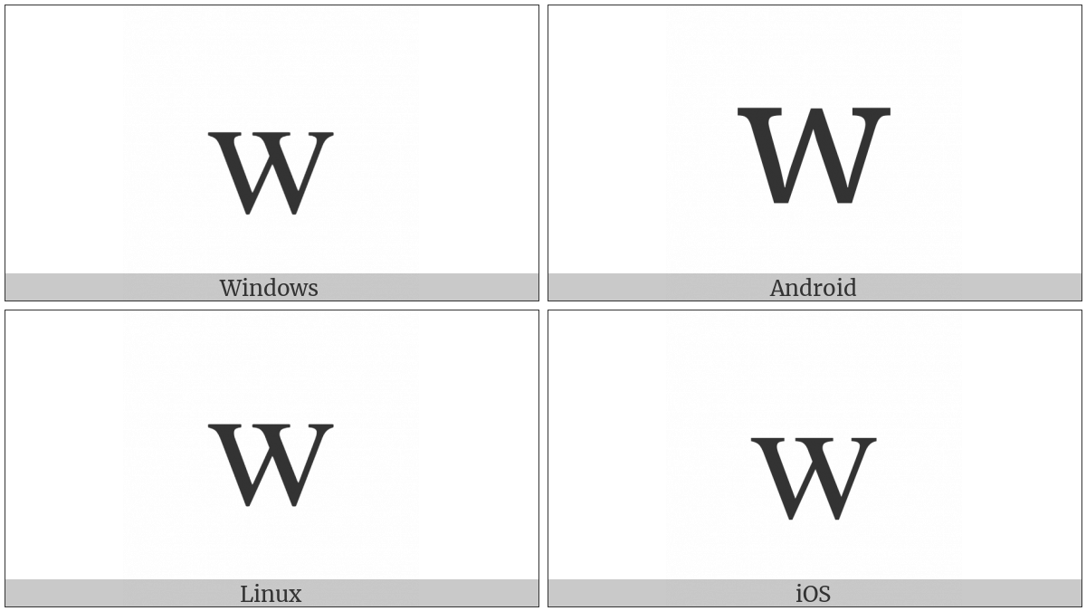 The image below shows how the “Latin Small Letter W” symbol might look like on different operating systems. If the font in which this web site is displayed does not contain the symbol and there is no fallback font able to render it, you can use the image below to get an idea of what it should look like.