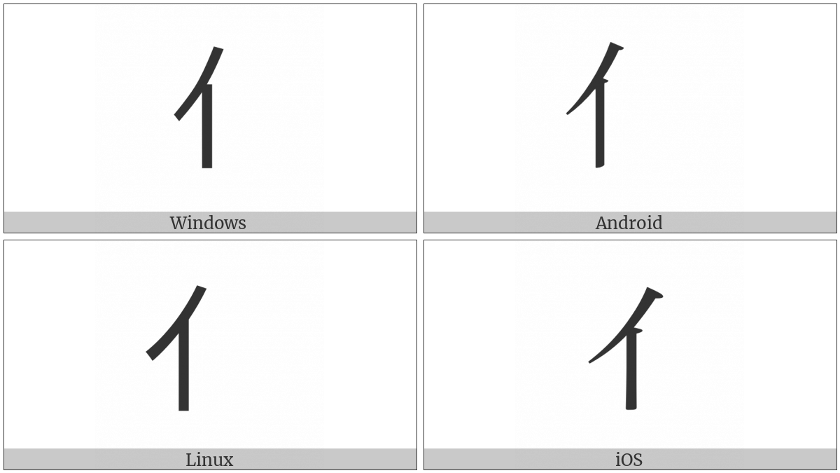 The image below shows how the “Cjk Radical Person” symbol might look like on different operating systems. If the font in which this web site is displayed does not contain the symbol and there is no fallback font able to render it, you can use the image below to get an idea of what it should look like.