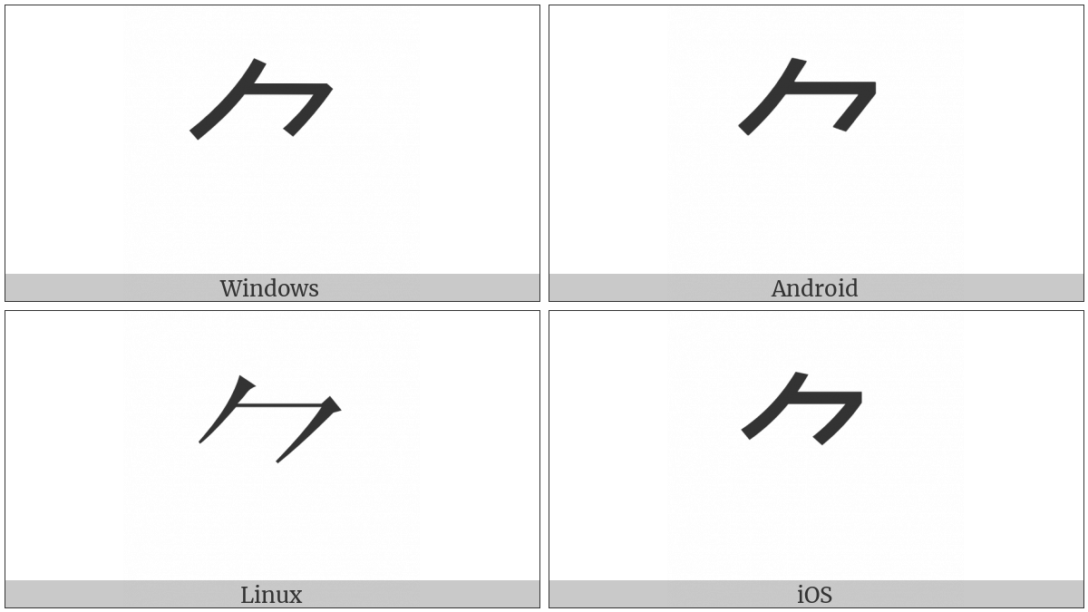The image below shows how the “Cjk Radical Knife One” symbol might look like on different operating systems. If the font in which this web site is displayed does not contain the symbol and there is no fallback font able to render it, you can use the image below to get an idea of what it should look like.