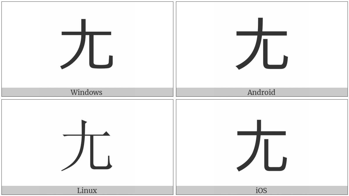 The image below shows how the “Cjk Radical Lame Three” symbol might look like on different operating systems. If the font in which this web site is displayed does not contain the symbol and there is no fallback font able to render it, you can use the image below to get an idea of what it should look like.