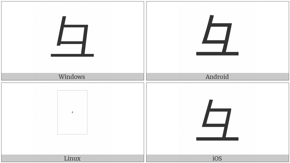 The image below shows how the “Cjk Radical Snout One” symbol might look like on different operating systems. If the font in which this web site is displayed does not contain the symbol and there is no fallback font able to render it, you can use the image below to get an idea of what it should look like.