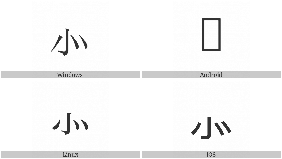 The image below shows how the “Cjk Radical Heart Two” symbol might look like on different operating systems. If the font in which this web site is displayed does not contain the symbol and there is no fallback font able to render it, you can use the image below to get an idea of what it should look like.