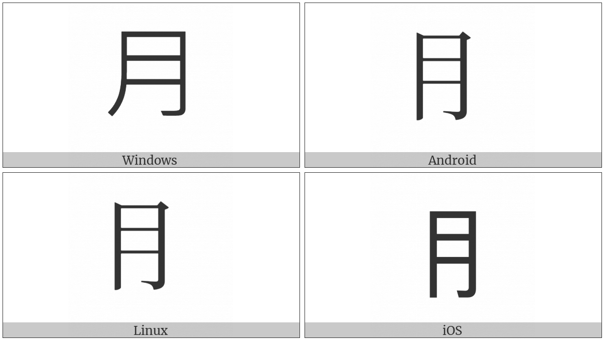 The image below shows how the “Cjk Radical Moon” symbol might look like on different operating systems. If the font in which this web site is displayed does not contain the symbol and there is no fallback font able to render it, you can use the image below to get an idea of what it should look like.