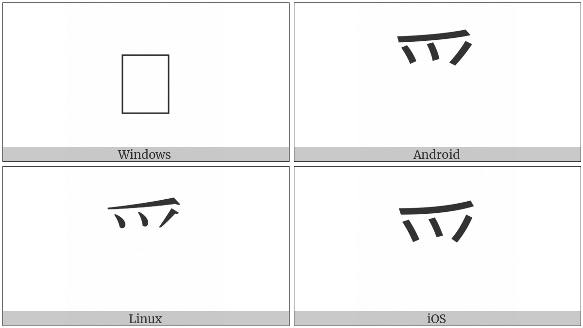 The image below shows how the “Cjk Radical Paw One” symbol might look like on different operating systems. If the font in which this web site is displayed does not contain the symbol and there is no fallback font able to render it, you can use the image below to get an idea of what it should look like.