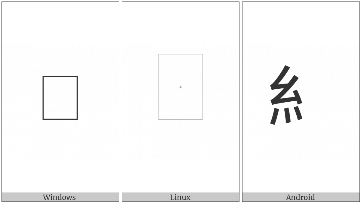 The image below shows how the “Cjk Radical Silk” symbol might look like on different operating systems. If the font in which this web site is displayed does not contain the symbol and there is no fallback font able to render it, you can use the image below to get an idea of what it should look like.