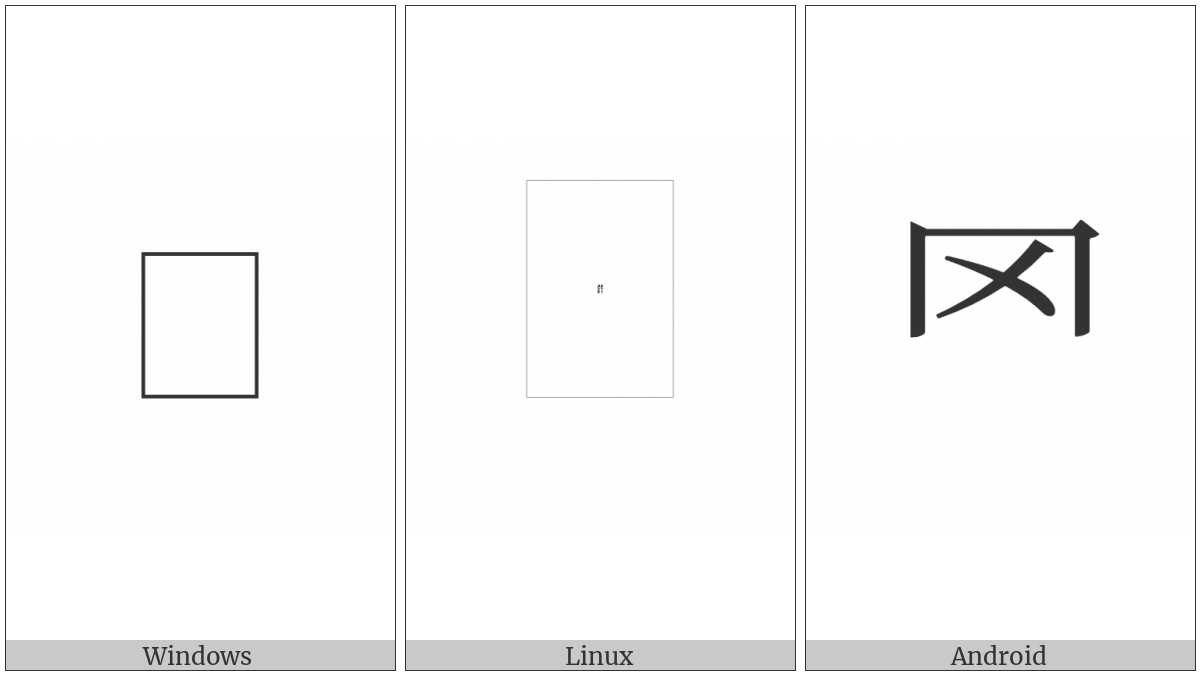 The image below shows how the “Cjk Radical Net One” symbol might look like on different operating systems. If the font in which this web site is displayed does not contain the symbol and there is no fallback font able to render it, you can use the image below to get an idea of what it should look like.