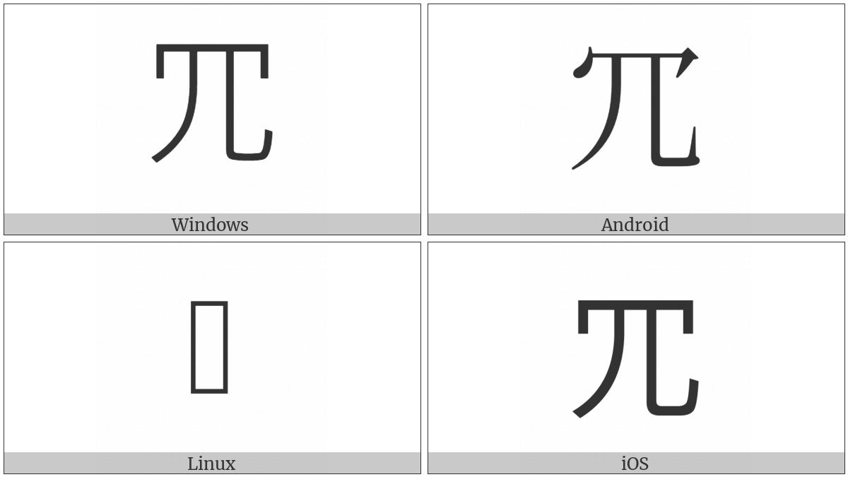 The image below shows how the “Cjk Radical Net Four” symbol might look like on different operating systems. If the font in which this web site is displayed does not contain the symbol and there is no fallback font able to render it, you can use the image below to get an idea of what it should look like.