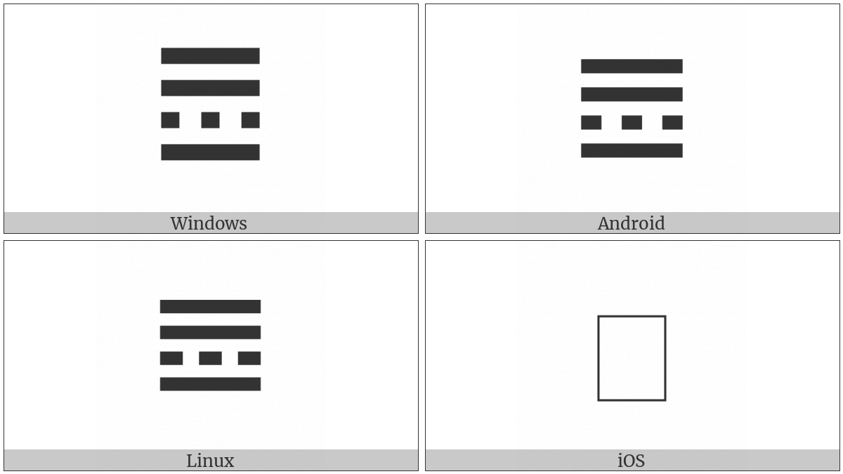The image below shows how the “Tetragram For Ascent” symbol might look like on different operating systems. If the font in which this web site is displayed does not contain the symbol and there is no fallback font able to render it, you can use the image below to get an idea of what it should look like.