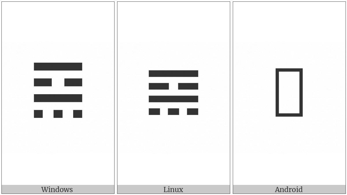 The image below shows how the “Tetragram For Youthfulness” symbol might look like on different operating systems. If the font in which this web site is displayed does not contain the symbol and there is no fallback font able to render it, you can use the image below to get an idea of what it should look like.