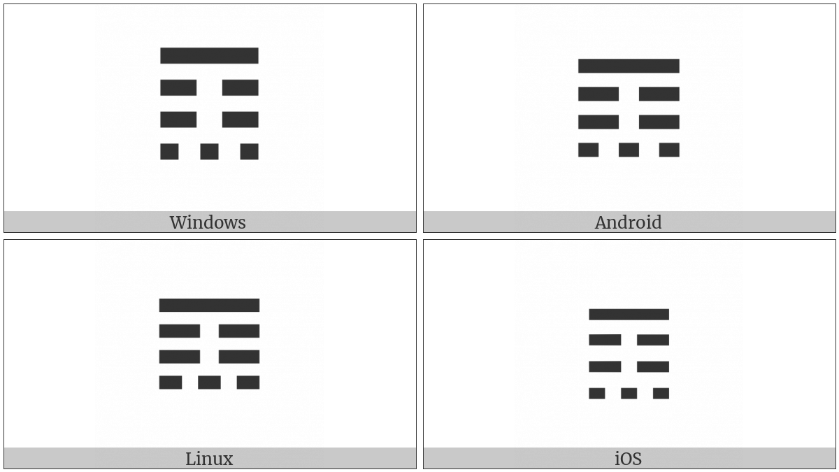 The image below shows how the “Tetragram For Reach” symbol might look like on different operating systems. If the font in which this web site is displayed does not contain the symbol and there is no fallback font able to render it, you can use the image below to get an idea of what it should look like.