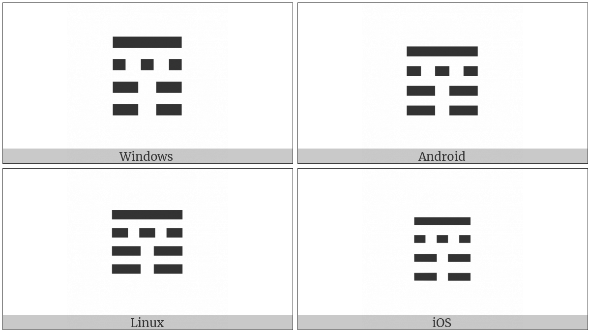 The image below shows how the “Tetragram For Ease” symbol might look like on different operating systems. If the font in which this web site is displayed does not contain the symbol and there is no fallback font able to render it, you can use the image below to get an idea of what it should look like.