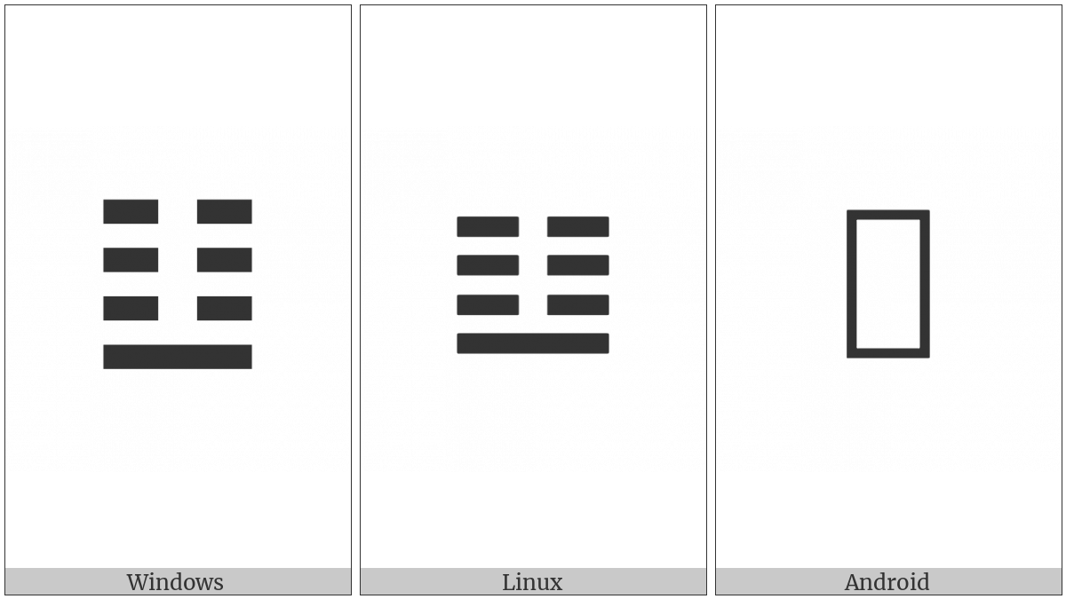 The image below shows how the “Tetragram For Law Or Model” symbol might look like on different operating systems. If the font in which this web site is displayed does not contain the symbol and there is no fallback font able to render it, you can use the image below to get an idea of what it should look like.