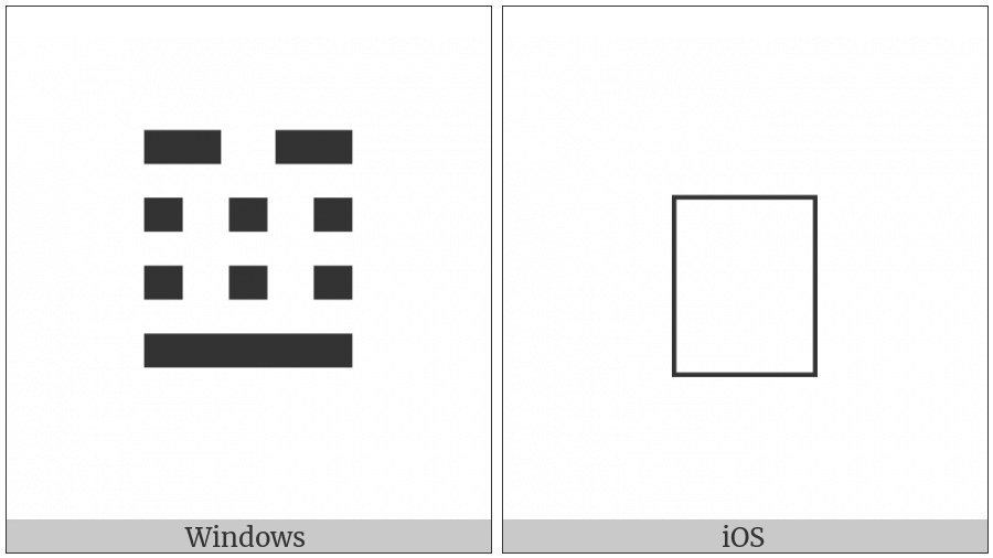The image below shows how the “Tetragram For Measure” symbol might look like on different operating systems. If the font in which this web site is displayed does not contain the symbol and there is no fallback font able to render it, you can use the image below to get an idea of what it should look like.