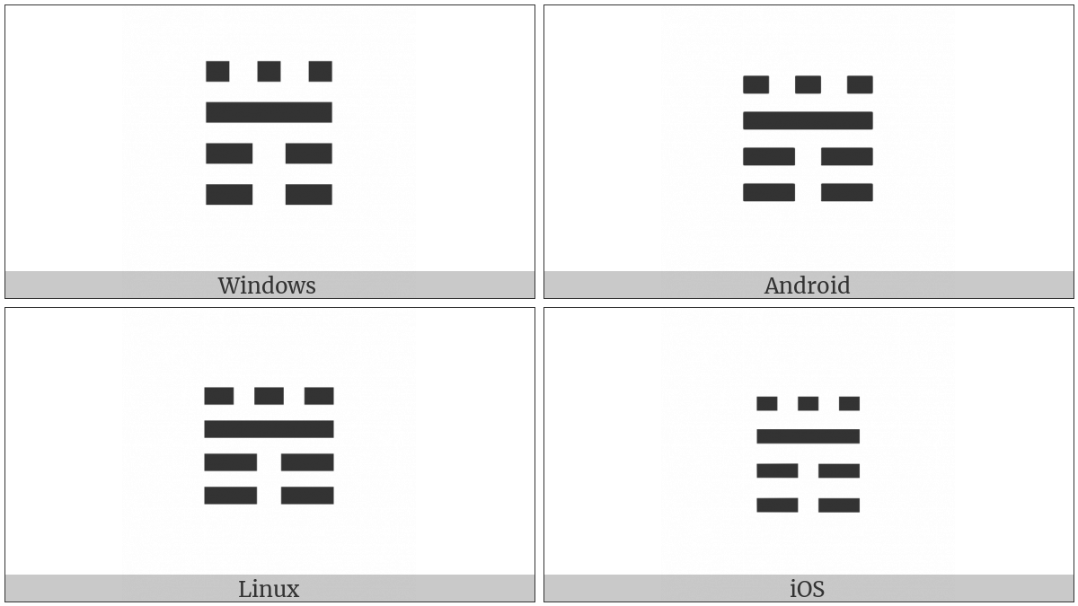 The image below shows how the “Tetragram For Massing” symbol might look like on different operating systems. If the font in which this web site is displayed does not contain the symbol and there is no fallback font able to render it, you can use the image below to get an idea of what it should look like.