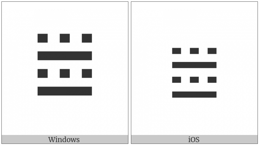 The image below shows how the “Tetragram For Embellishment” symbol might look like on different operating systems. If the font in which this web site is displayed does not contain the symbol and there is no fallback font able to render it, you can use the image below to get an idea of what it should look like.