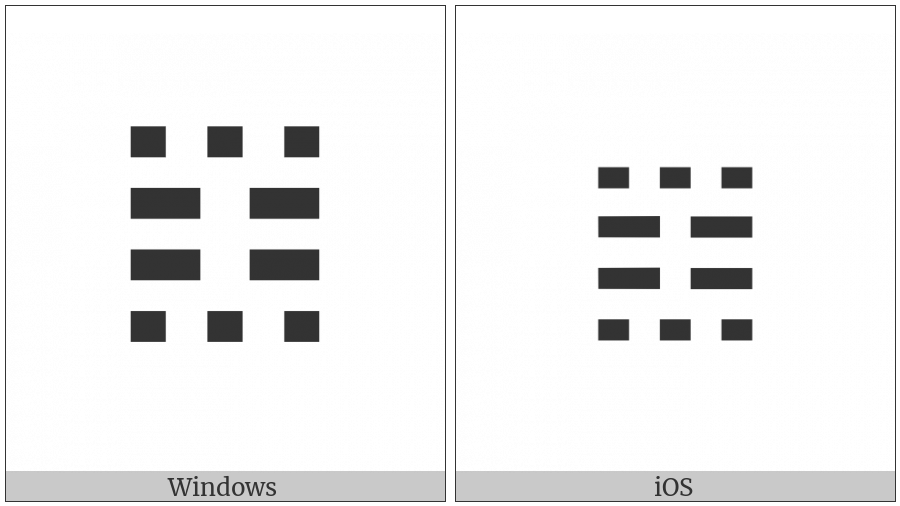 The image below shows how the “Tetragram For Exhaustion” symbol might look like on different operating systems. If the font in which this web site is displayed does not contain the symbol and there is no fallback font able to render it, you can use the image below to get an idea of what it should look like.