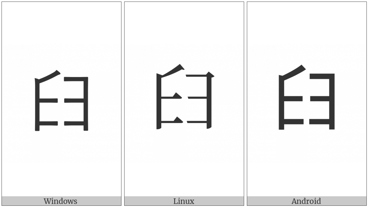 The image below shows how the “Cjk Radical Mortar” symbol might look like on different operating systems. If the font in which this web site is displayed does not contain the symbol and there is no fallback font able to render it, you can use the image below to get an idea of what it should look like.