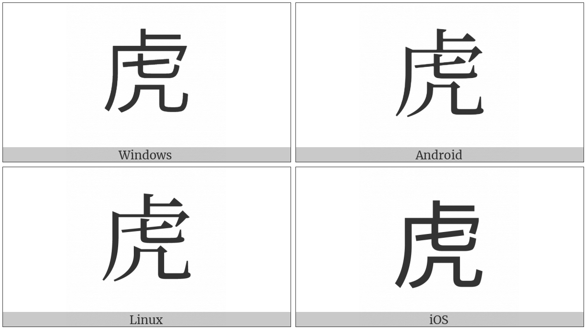 The image below shows how the “Cjk Radical Tiger” symbol might look like on different operating systems. If the font in which this web site is displayed does not contain the symbol and there is no fallback font able to render it, you can use the image below to get an idea of what it should look like.