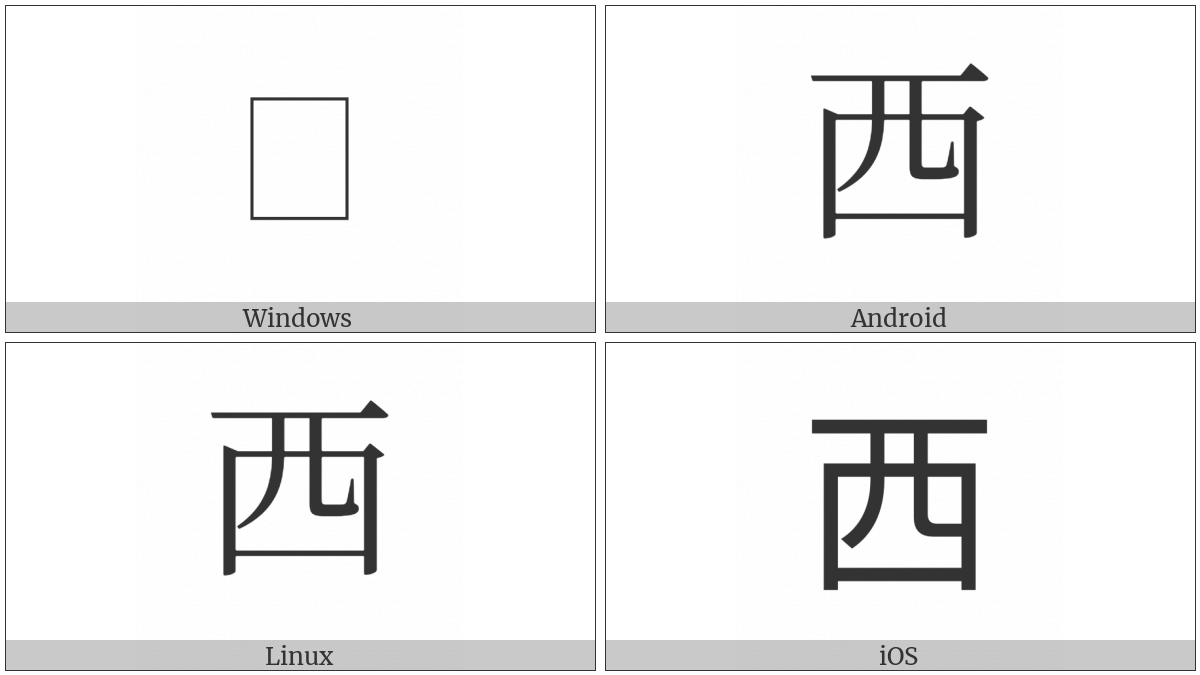 The image below shows how the “Cjk Radical West Two” symbol might look like on different operating systems. If the font in which this web site is displayed does not contain the symbol and there is no fallback font able to render it, you can use the image below to get an idea of what it should look like.