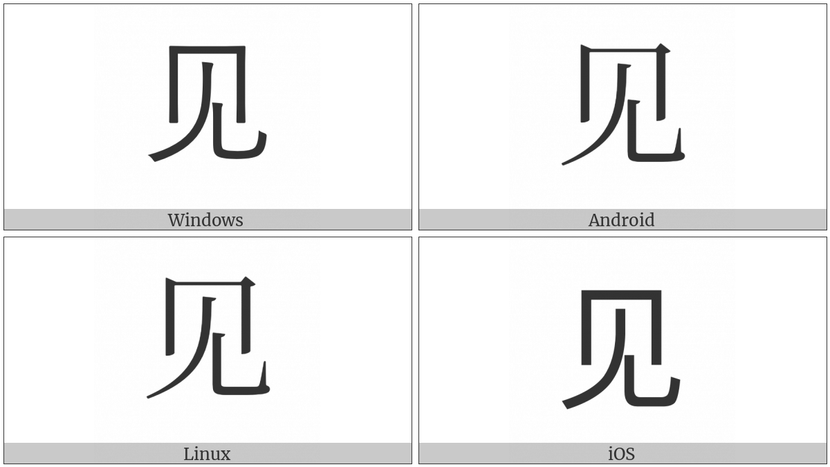 The image below shows how the “Cjk Radical C-Simplified See” symbol might look like on different operating systems. If the font in which this web site is displayed does not contain the symbol and there is no fallback font able to render it, you can use the image below to get an idea of what it should look like.