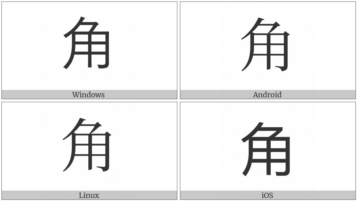 The image below shows how the “Cjk Radical Simplified Horn” symbol might look like on different operating systems. If the font in which this web site is displayed does not contain the symbol and there is no fallback font able to render it, you can use the image below to get an idea of what it should look like.