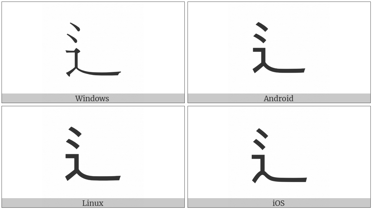The image below shows how the “Cjk Radical Walk One” symbol might look like on different operating systems. If the font in which this web site is displayed does not contain the symbol and there is no fallback font able to render it, you can use the image below to get an idea of what it should look like.