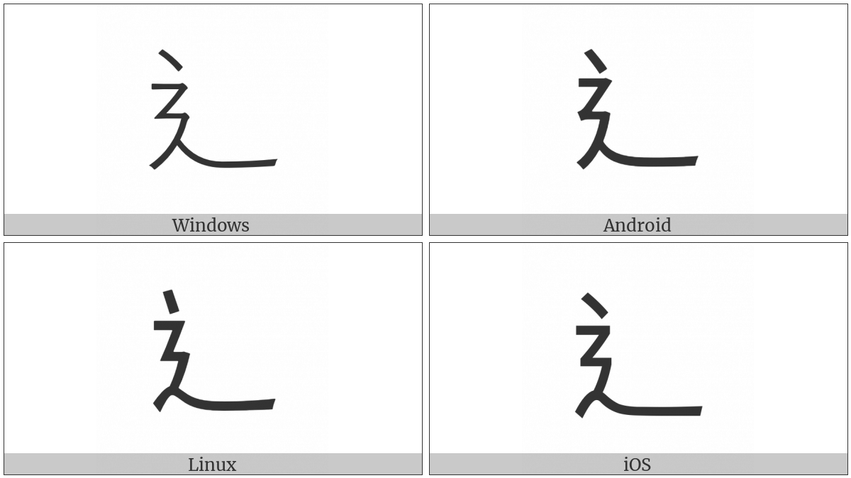 The image below shows how the “Cjk Radical Walk Two” symbol might look like on different operating systems. If the font in which this web site is displayed does not contain the symbol and there is no fallback font able to render it, you can use the image below to get an idea of what it should look like.
