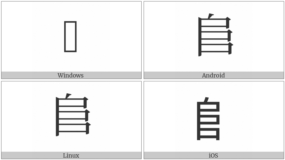 The image below shows how the “Cjk Radical Mound One” symbol might look like on different operating systems. If the font in which this web site is displayed does not contain the symbol and there is no fallback font able to render it, you can use the image below to get an idea of what it should look like.