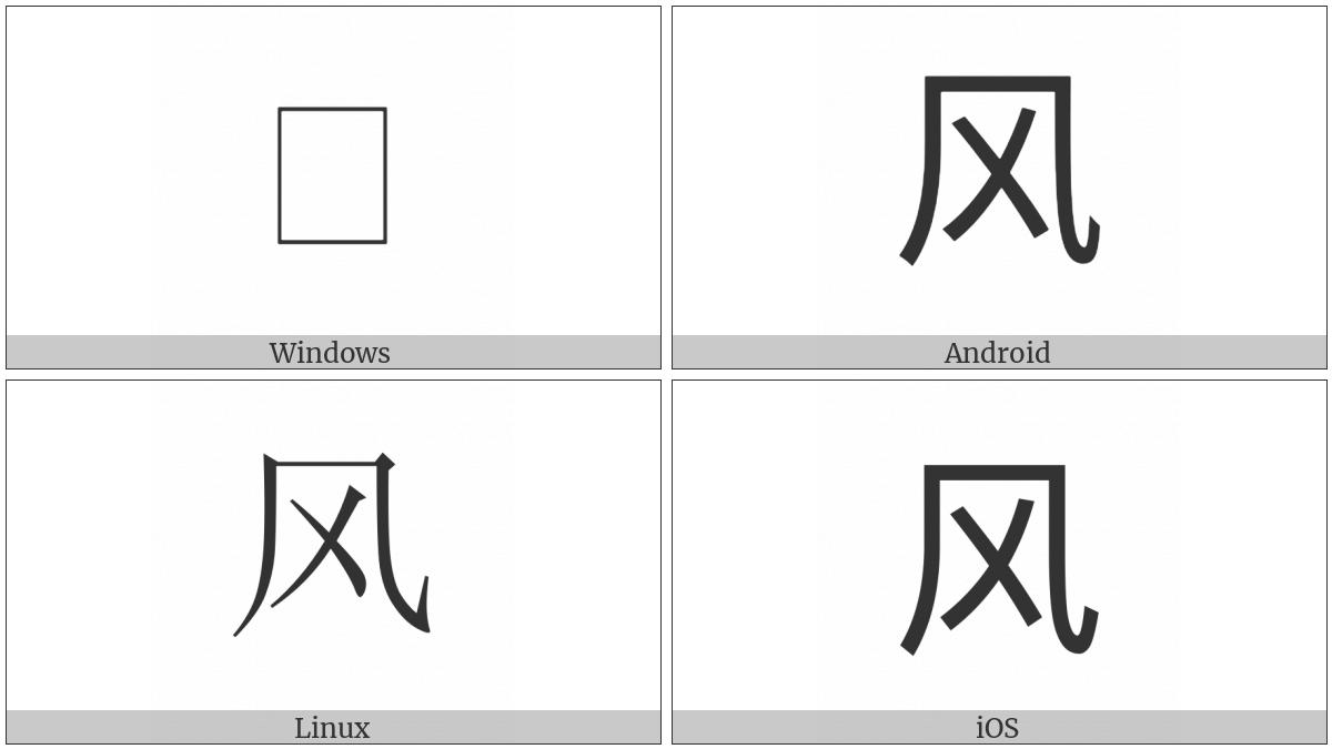 The image below shows how the “Cjk Radical C-Simplified Wind” symbol might look like on different operating systems. If the font in which this web site is displayed does not contain the symbol and there is no fallback font able to render it, you can use the image below to get an idea of what it should look like.