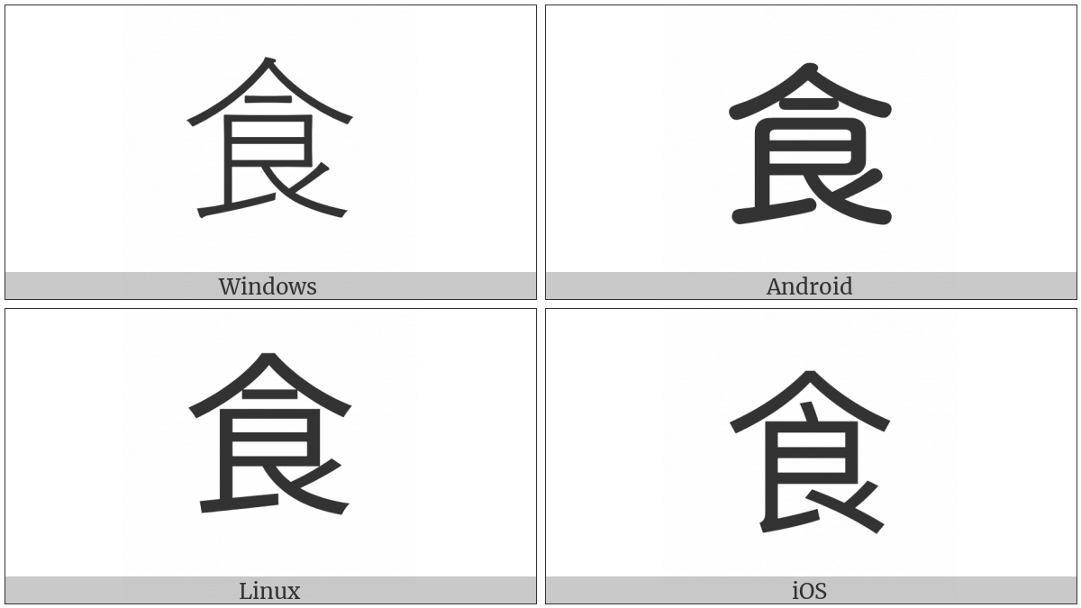 The image below shows how the “Cjk Radical Eat One” symbol might look like on different operating systems. If the font in which this web site is displayed does not contain the symbol and there is no fallback font able to render it, you can use the image below to get an idea of what it should look like.