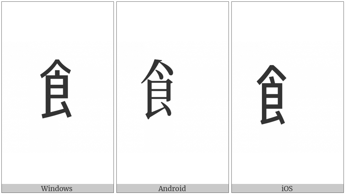 The image below shows how the “Cjk Radical Eat Three” symbol might look like on different operating systems. If the font in which this web site is displayed does not contain the symbol and there is no fallback font able to render it, you can use the image below to get an idea of what it should look like.
