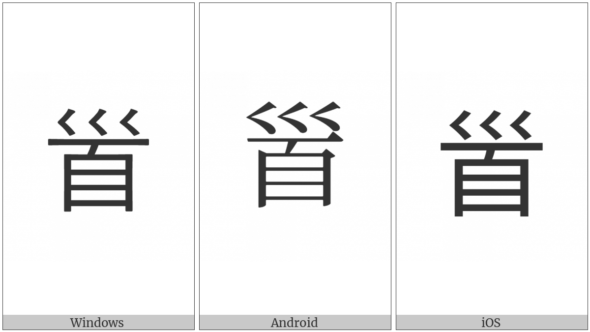 The image below shows how the “Cjk Radical Head” symbol might look like on different operating systems. If the font in which this web site is displayed does not contain the symbol and there is no fallback font able to render it, you can use the image below to get an idea of what it should look like.