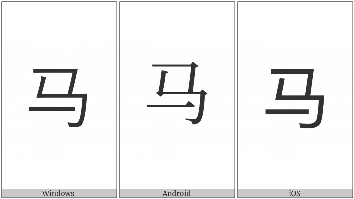 The image below shows how the “Cjk Radical C-Simplified Horse” symbol might look like on different operating systems. If the font in which this web site is displayed does not contain the symbol and there is no fallback font able to render it, you can use the image below to get an idea of what it should look like.