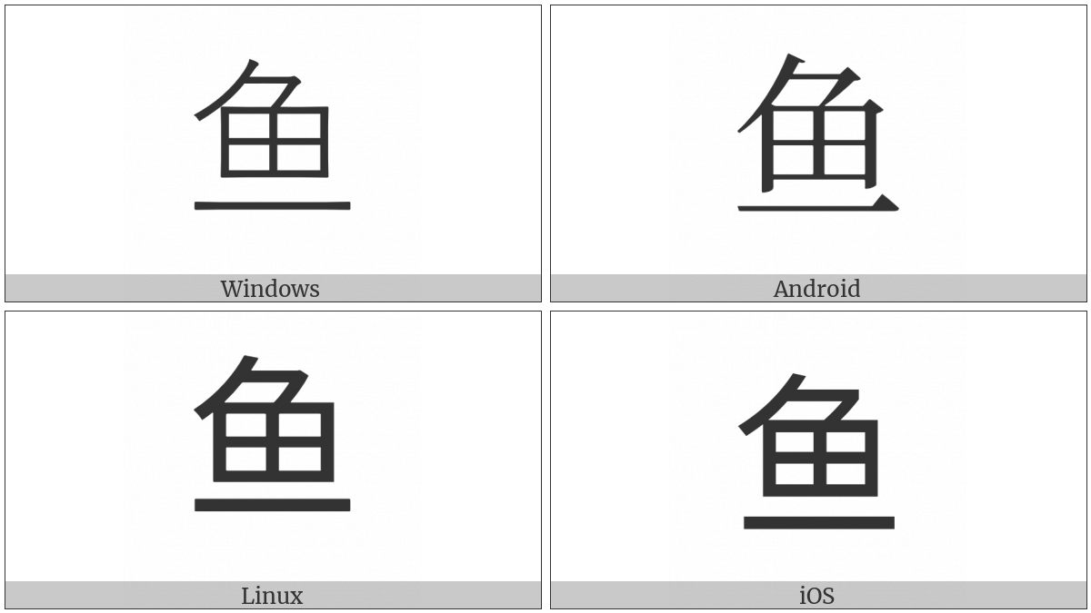 The image below shows how the “Cjk Radical C-Simplified Fish” symbol might look like on different operating systems. If the font in which this web site is displayed does not contain the symbol and there is no fallback font able to render it, you can use the image below to get an idea of what it should look like.