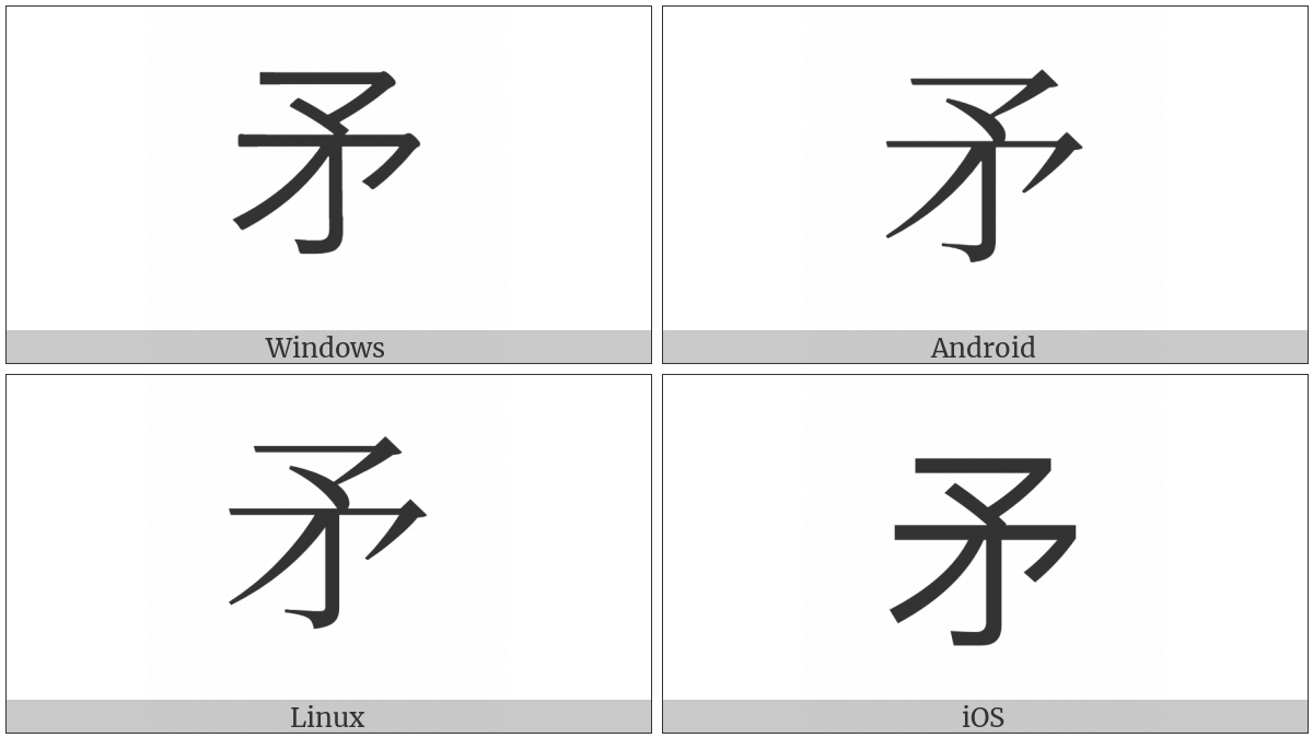 The image below shows how the “Kangxi Radical Spear” symbol might look like on different operating systems. If the font in which this web site is displayed does not contain the symbol and there is no fallback font able to render it, you can use the image below to get an idea of what it should look like.