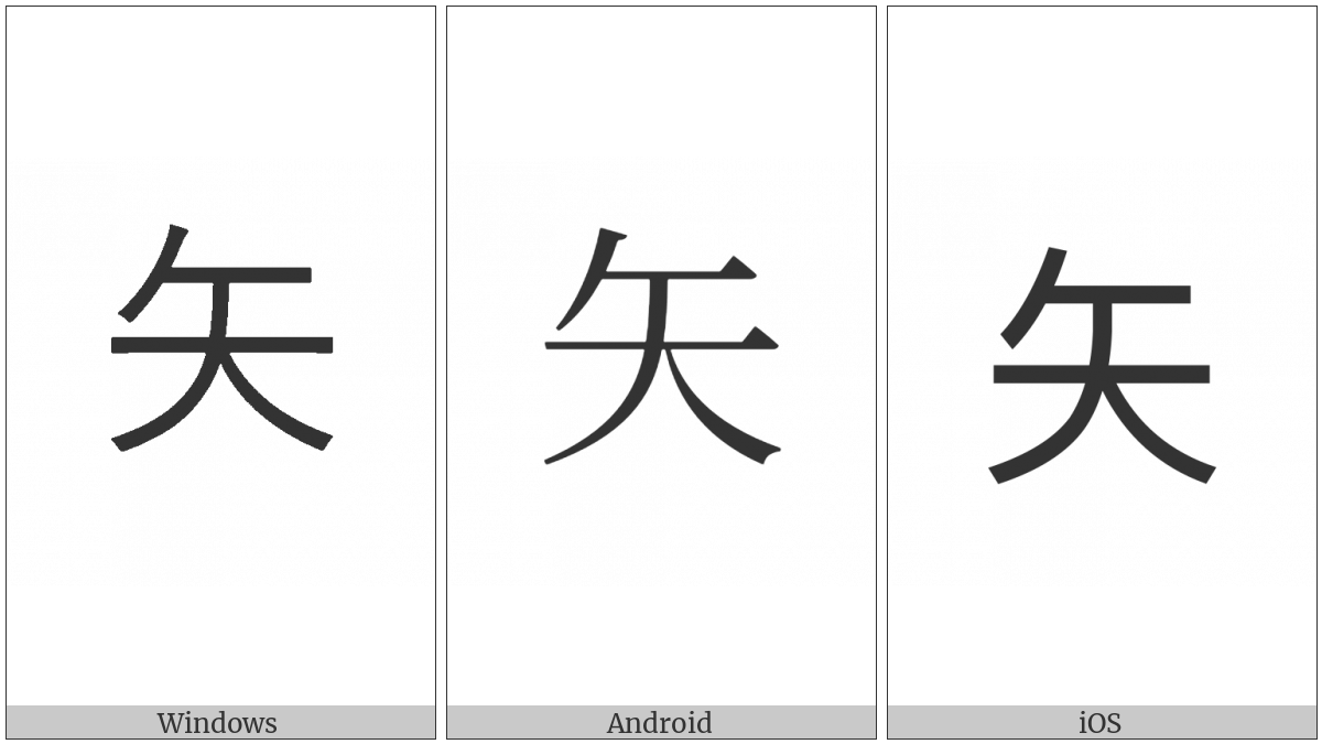 The image below shows how the “Kangxi Radical Arrow” symbol might look like on different operating systems. If the font in which this web site is displayed does not contain the symbol and there is no fallback font able to render it, you can use the image below to get an idea of what it should look like.