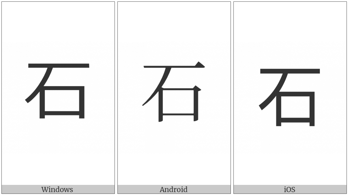 The image below shows how the “Kangxi Radical Stone” symbol might look like on different operating systems. If the font in which this web site is displayed does not contain the symbol and there is no fallback font able to render it, you can use the image below to get an idea of what it should look like.