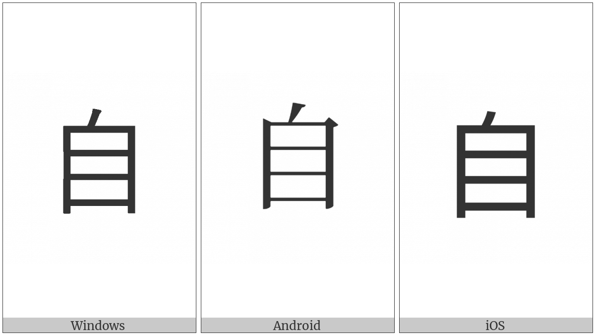 The image below shows how the “Kangxi Radical Self” symbol might look like on different operating systems. If the font in which this web site is displayed does not contain the symbol and there is no fallback font able to render it, you can use the image below to get an idea of what it should look like.